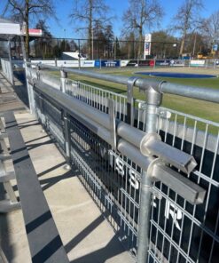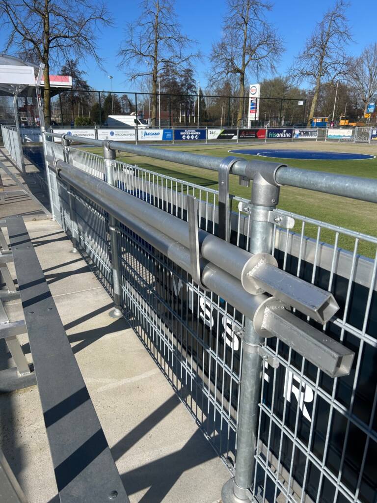 Montage aan hekwerk langs kunstgrasveld