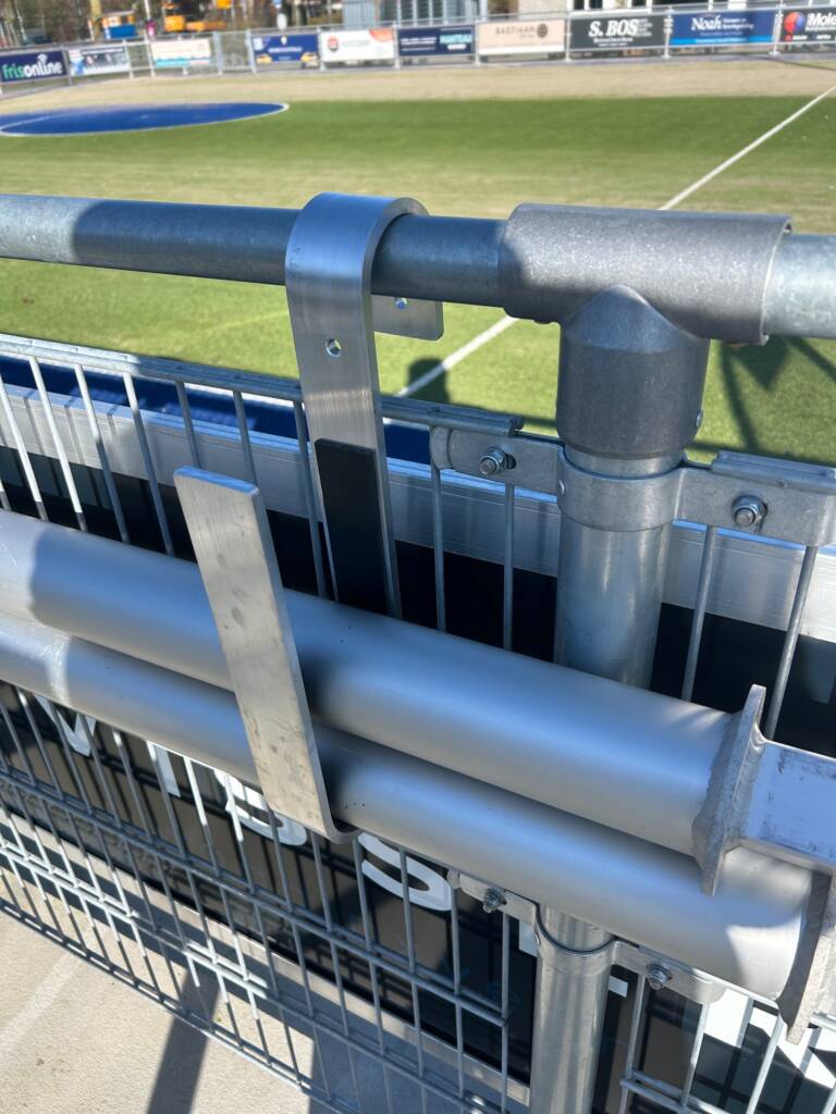 Met deze ophangbeugels voor korfbalpalen bergt u uw aluminium korfbalpalen veilig, overzichtelijk en direct naast het veld op. De beugels worden eenvoudig bevestigd aan het hekwerk langs uw kunstgrasveld, waardoor de korfbalpalen altijd binnen handbereik hangen. Dit voorkomt onnodig gesleep en bespaart tijd tijdens trainingen en wedstrijden.